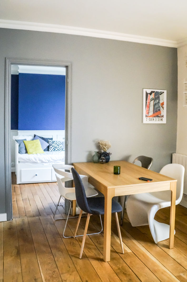 Les pièces en enfilade ont été peintes dans différents tons de bleu et de gris, offrant ainsi une harmonie visuelle qui dynamise l’espace. J'ai favorisé l'utilisation du bois pour apporter une touche chaleureuse, tout en intégrant du métal pour créer un contraste élégant et dynamique.